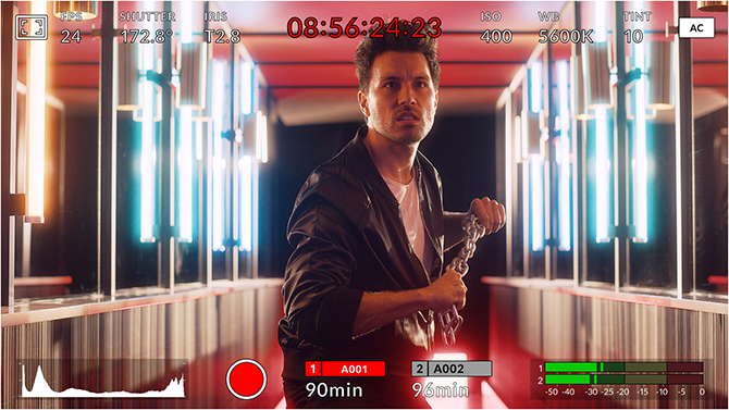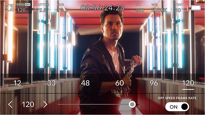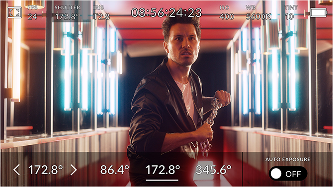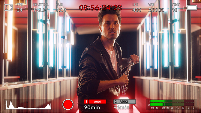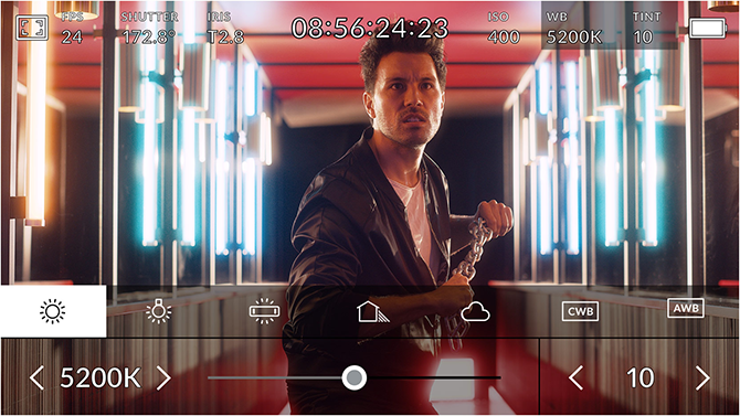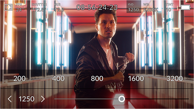 HUD显示包含帧率、光圈、时间码、快门角度、白平衡、ISO、音频电平等众多关键信息。以指尖上下滑动即可显示或隐藏HUD显示。例如,您可以轻触“WB”提示图标来调整白平衡设置,或点按音频表来更改音频电平。它采用的是全面交互式设计,因此当您点按任意选项时就能立即更改设置,无需逐层搜索复杂的菜单!
