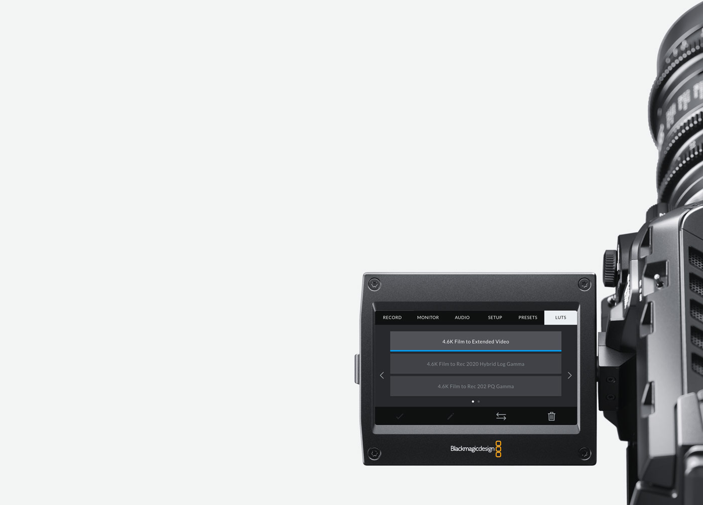 URSA Mini Pro摄影机采用先进软件设计,能为您带来更快速、更直观的畅快操作体验!它的HUD显示界面可实现所有重要功能的快捷设置;优雅美观的数字场记板设计使得元数据输入变得轻而易举;主菜单可提供记录、监看、音频、设置、预设及3D LUT等各项摄影机控制;所有操作都在您指尖轻触或滑动间轻松实现。摄影机的每项功能都可作为高性能APP单独运行,相比其他简单的摄影机软件而言,它具有更强的稳定性!更棒的是,将来我们还能为其添加更多优秀的功能!