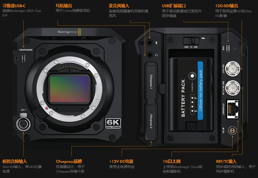 Blackmagic PYXIS内置两个CFexpress存储卡记录单元,并设有USB-C扩展端口,可以直接记录到外接闪存盘或SSD。CFexpress存储介质比以往的存储介质更加耐用且速度更快,因此非常适合记录全分辨率12bit的Blackmagic RAW文件。想象一下,用一张256GB的CFexpress存储卡记录超过一个小时的全分辨率6K影像!CFexpress双插槽支持存储卡热插拔操作,可实现不间断记录!CFexpress存储卡拥有高速性能,非常适合安装在计算机上并使用附赠的DaVinci Resolve Studio软件直接进行剪辑!