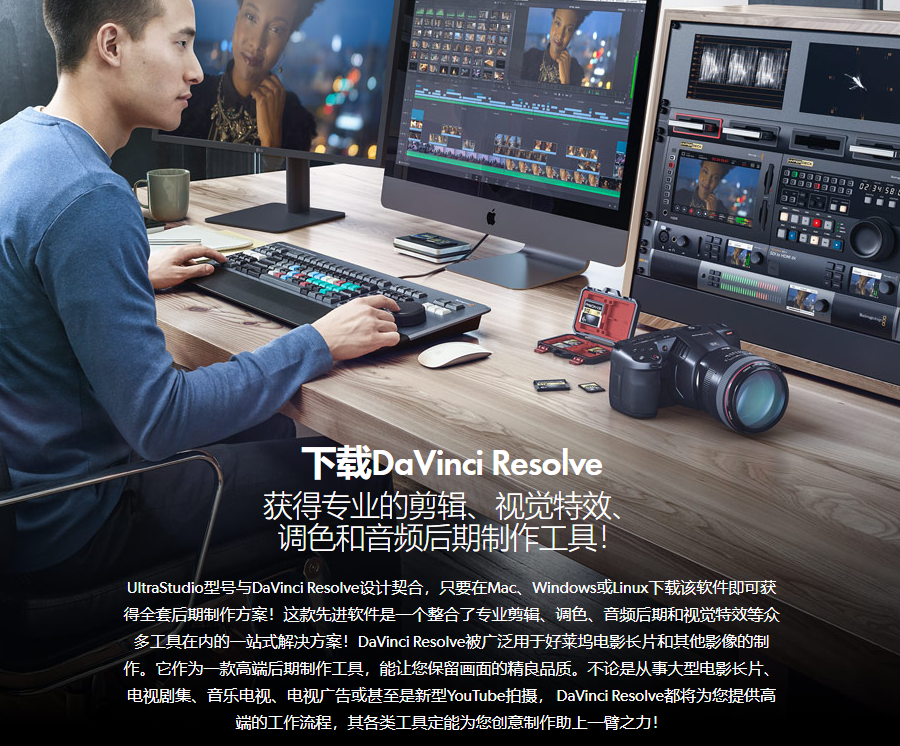 UltraStudio针对Mac系统的独特要求进行了专门的设计,支持一系列常用流行视频软件。其附带的驱动专为高性能视频所优化设计,并且还能满足DaVinci Resolve、Final Cut Pro X、Premiere Pro CC、Avid Media Composer等剪辑软件的各项要求。视觉特效方面它可全面兼容Fusion、After Effects CC和Photoshop CC。音频方面可兼容ProTools、Steinberg Nuendo和Cubase。流媒体播放方面可使用Flash Media Live Encoder、Wirecast、Livestream Producer。UltraStudio支持WDM和DirectShow,在Windows系统上可使用范围广泛的一系列软件!剪辑工作方面您可使用DaVinci Resolve、Avid Media Composer、Premiere Pro CC、MAGIX Vegas Pro、Corel VideoStudio Pro、CyberLink Power Director和MAGIX Video Pro。视觉特效方面您可使用Fusion、After Effects CC和Photoshop CC。音频软件方面它支持Steinberg Nuendo和Cubase。流媒体播放方面它可兼容Flash Media Live Encoder、Xsplit Broadcaster、Wirecast和Livestream Producer。