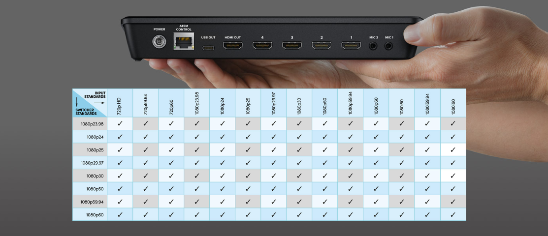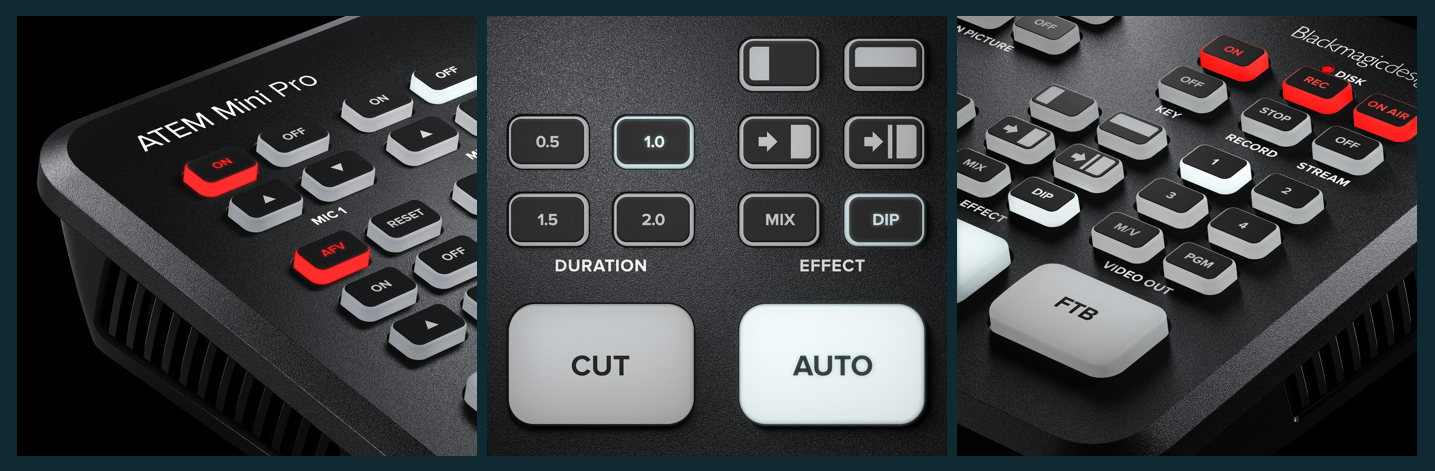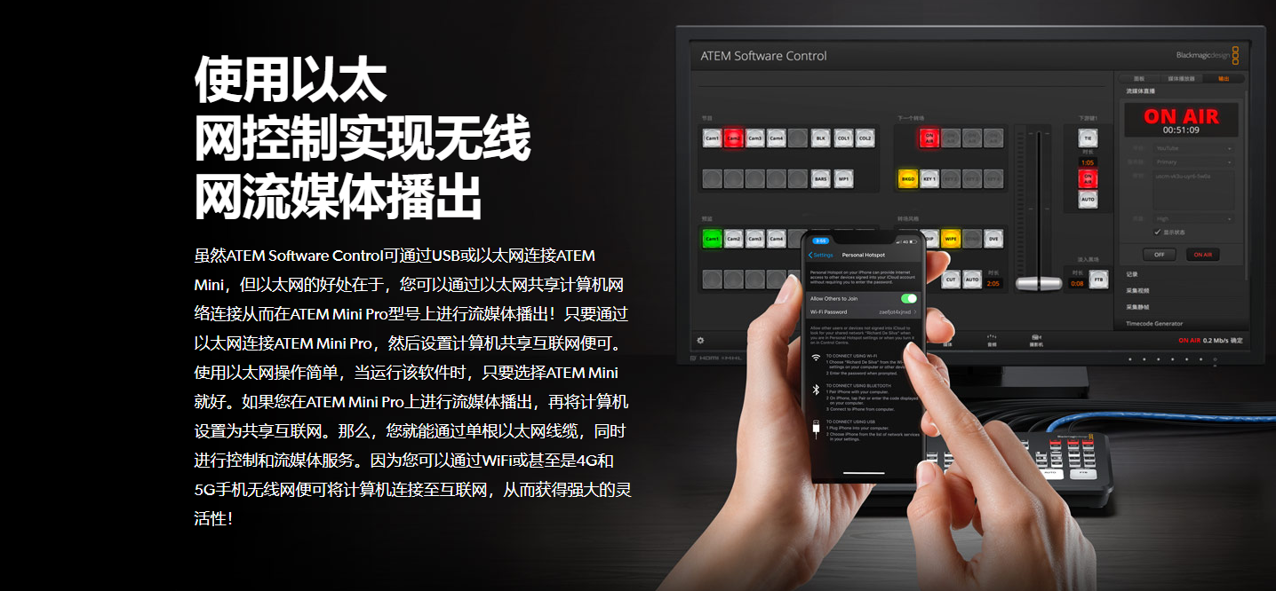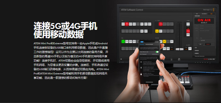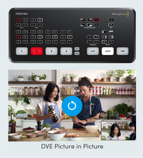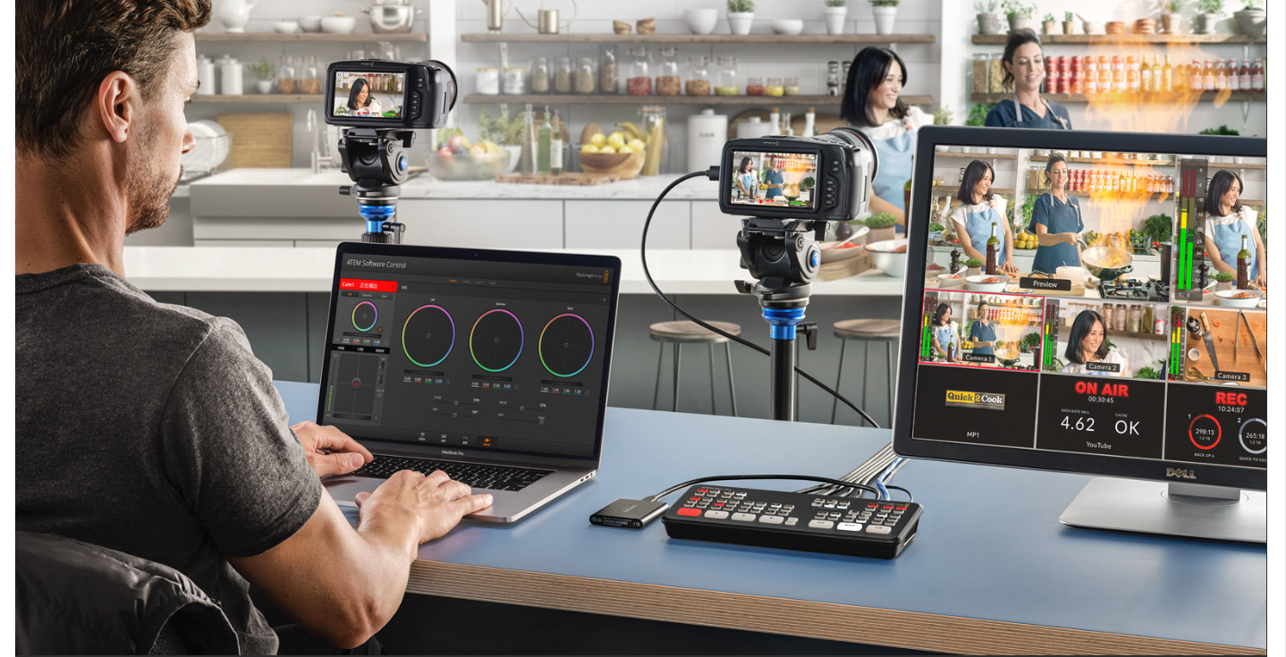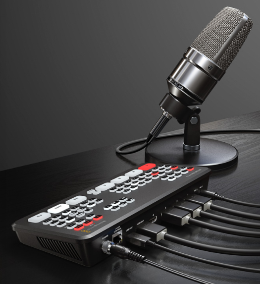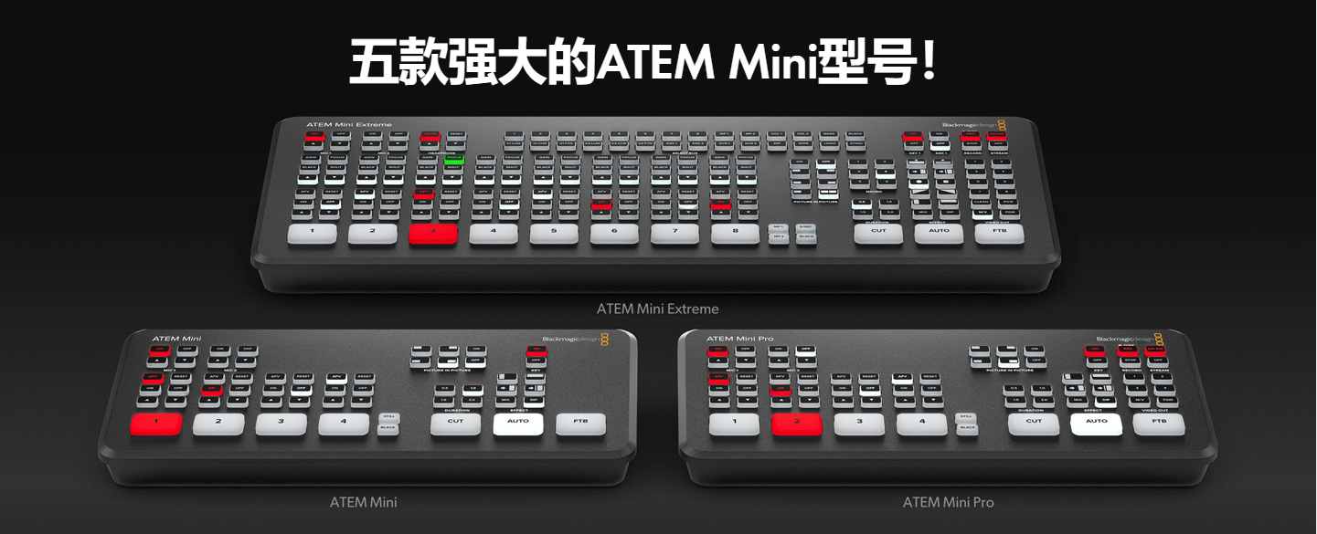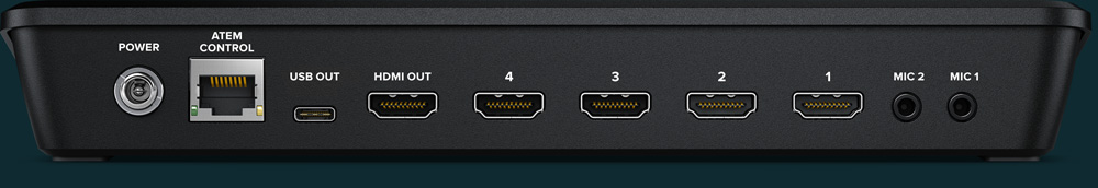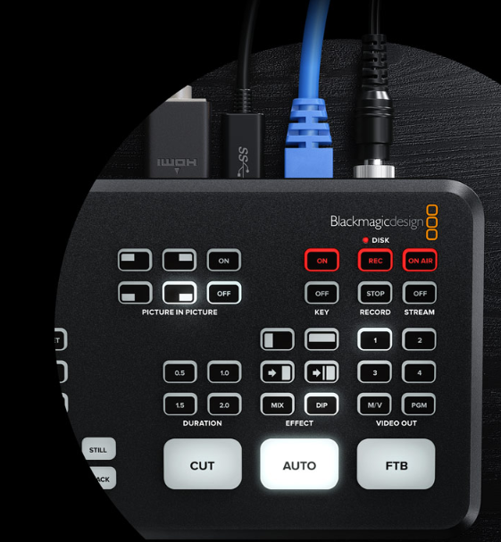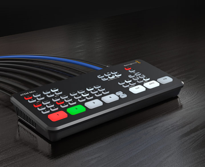 ATEM Mini设置简单,使用便捷。它配备4路带格式转换功能的HDMI输入、USB网络摄像头输出、HDMI输出,以及带有均衡器和动态控制的Fairlight调音台,还有可用于画中画效果的DVE功能、多种转场特效、绿屏色键、拥有20个静帧存储量用于标题制作的媒体池,并且免费提供ATEM Software Control。
