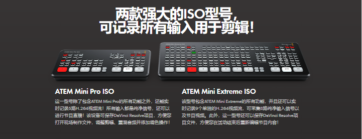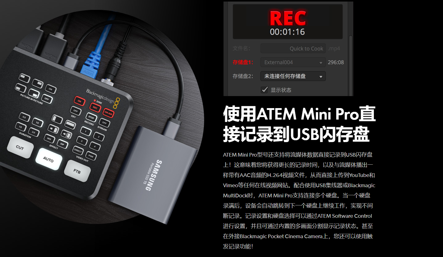 这一型号除了包含ATEM Mini的所有功能之外,更在此基础上有所提升!它能直接将影像以H.264格式记录到USB闪存盘,并且可以通过以太网直接进行流媒体直播,通过YouTube Live等平台播放内容。除此之外,它还有多画面分割功能,可显示4路摄影机媒体、预监和节目画面,以及记录、直播和音频状态。