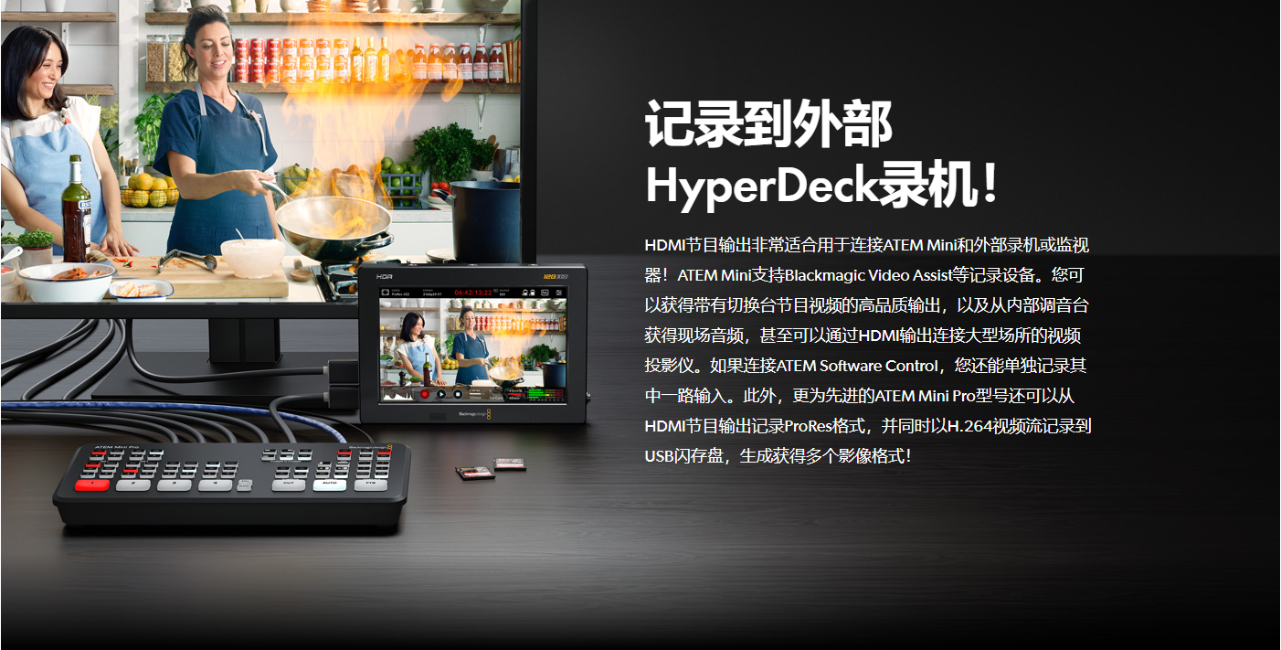 ATEM Mini切换台能助您打造出专业的多机位制作,实现YouTube网络流媒体直播,并通过Skype或Zoom进行富有创意的商务演示,一切从未如此简单!只需连接ATEM Mini,就能实时切换4路高品质视频摄影机输入信号,让画面质量大幅提升;或连接计算机播放PPT幻灯片或游戏画面。其内置DVE功能,可实现精彩炫目的画中画效果,是添加评论内容的理想工具。同时,它还提供海量视频效果供您使用!所有ATEM Mini型号都搭载USB接口,可被识别为网络摄像头信号,因此您可以使用任何网络流媒体直播软件,而ATEM Mini Pro型号还可实现流媒体直播,并通过USB硬盘进行记录。ATEM Mini还蕴含用于高端制作的广播级功能。