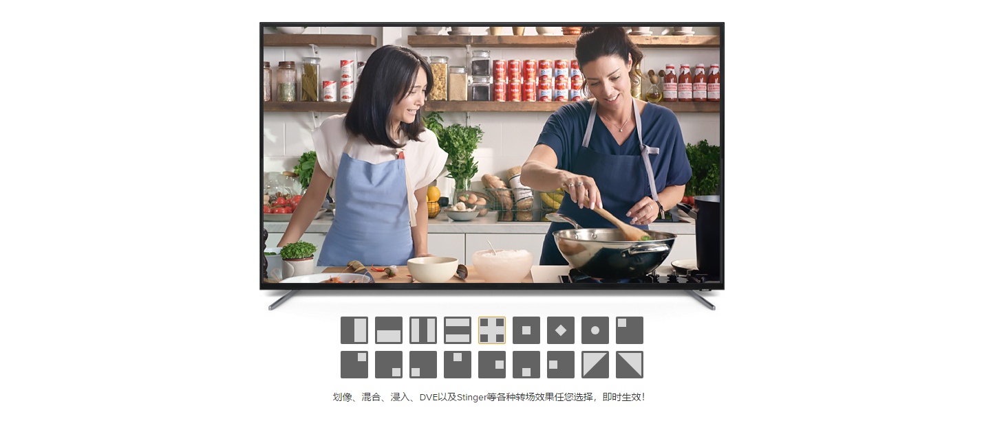 ATEM Mini内含一系列广泛的广播级品质的HD原生转场,比如混合、浸入、划像等等。所有转场均可通过调整时长、边框色彩、边框宽度、位置和方向等参数实现自定义,您还可以在转场中使用DVE,将图文移至划像边缘,即图文划像功能,该效果在竞技节目中经常使用。为了减少误操作,ATEM Mini还配备了一项预监转场功能,让您先检查转场,再切入播出!
