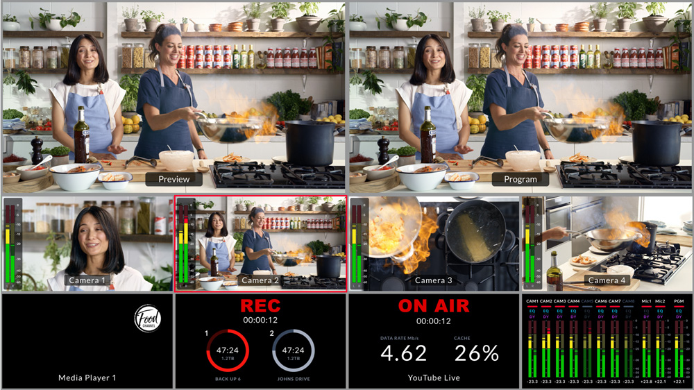 进行较大规模的多机位现场制作时,能在一台监视器上同时查看所有视频信号源将会非常有用。ATEM Mini Pro和ATEM Mini Extreme型号配备专业的多画面分割功能,所有视频输入一览无余,还能在单台HDMI电视机或监视器上显示预监和节目画面!只需在前面板的视频输出控制按钮中选择M/V就能启用多画面分割!每台摄影机的画面均包含Tally提示灯,让您明确哪路信号源处于播出状态,并且每个分割画面都有自定义标签和音频表。ATEM Mini Extreme型号还可以选择多达16个自定义分割画面!不仅如此,多画面分割功能还带有记录、流媒体直播状态提示以及调音台!