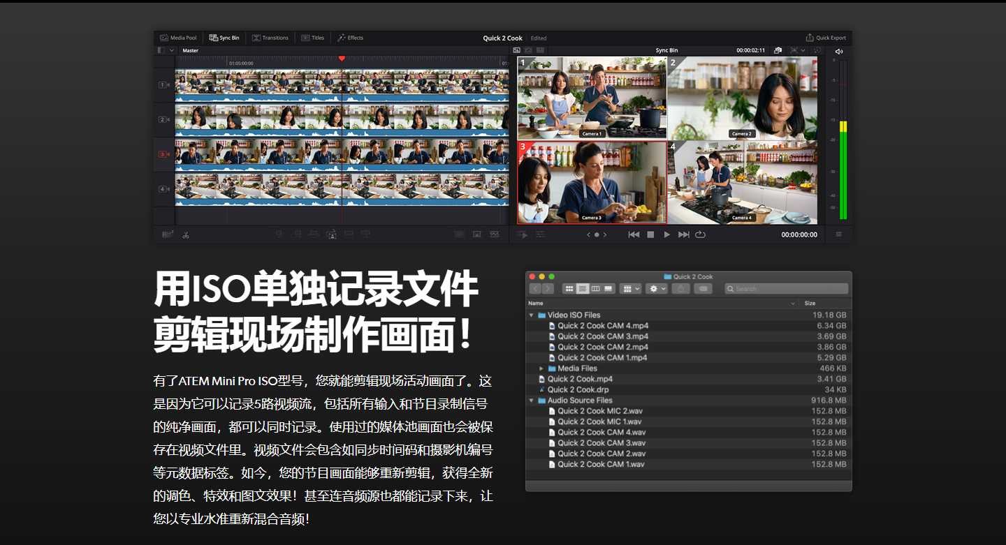 ISO型号还能保存DaVinci Resolve项目文件,您只要点击它就能将现场制作文件作为视频剪辑打开。所有的画面切换、叠化效果以及媒体池图文都能加载进来。这意味着您可以微调编辑点,甚至替换整个镜头!您可以使用DaVinci Resolve的同步媒体夹,通过多画面分割来选择新的镜头,非常简单,甚至还可以重新链接到Blackmagic RAW摄影机文件来添加专业的调色处理并以Ultra HD导出节目。