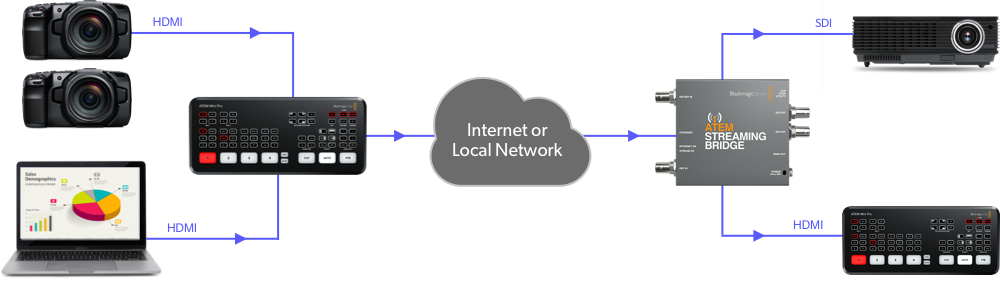 ATEM Streaming Bridge是一款视频转换器,它可以从任何ATEM Mini Pro或ATEM Mini Extreme上接收H.264视频流并转换回SDI和HDMI视频,以便您将视频发送至本地以太网络的其他地点,或通过互联网发送至全世界!该设备采用先进的H.264编解码,可以非常低的数据速率实现更高的品质。播出机构和播客可以联手打造节目,并构建ATEM Mini远程演播室全球大网络。它的设置简单便捷,只要使用ATEM软件程序创建设置文件,再通过电子邮件将这些文件发送至远程演播室即可。ATEM Streaming Bridge是将ATEM Mini作为远程播出室使用的理想之选!