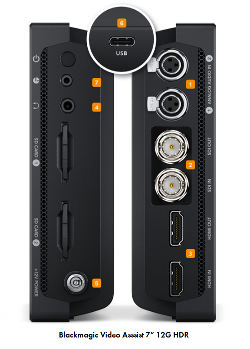 Video Assist搭载种类丰富的视音频接口,包括多速率SDI接口,所有型号均可处理SD、HD格式,在12G-SDI型号上还可以处理Ultra HD格式。内置HDMI接口可用于连接HDMI摄影机,也可以连接消费级电视机或视频投影仪来实现监看;7英寸型号搭载Mini XLR输入,可用于连接麦克风和外接调音台的音频输入。USB-C接口可连接外置硬盘或SSD进行记录,闪存通常都比SD卡的存储容量大很多,因此您可以获得非常长的记录时长。Video Assist还设有12V DC电源接口,12G型号还设有带锁电源接口。
