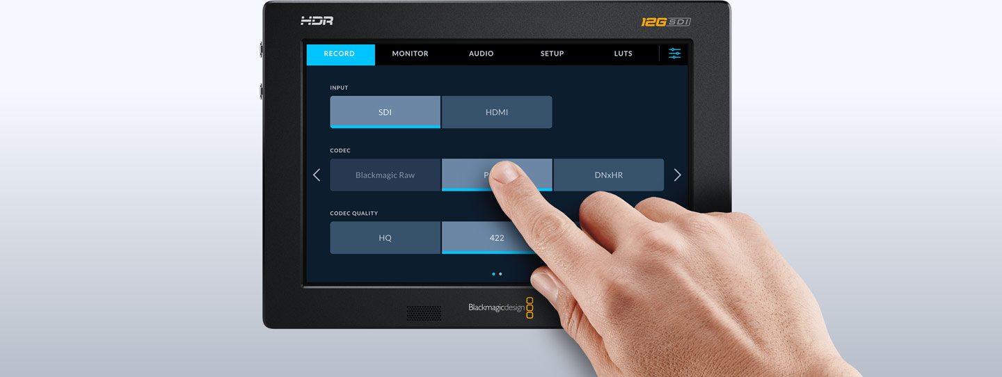 创新的LCD触摸屏用户界面能提供全面细致的控制。屏幕上设有播放、停止以及记录按钮,外加可滚动查看记录内容的迷你时间线,在画面上来回滑动还能慢速搜索片段!LCD屏幕以HUD风格显示时间码、视频格式、存储介质状态以及音频表等功能。通过触摸屏可启用示波器,还可以实现对焦和曝光辅助功能。您能通过这块大尺寸LCD屏幕进入大量设置控制选项,还可以加载和保存3D LUT!