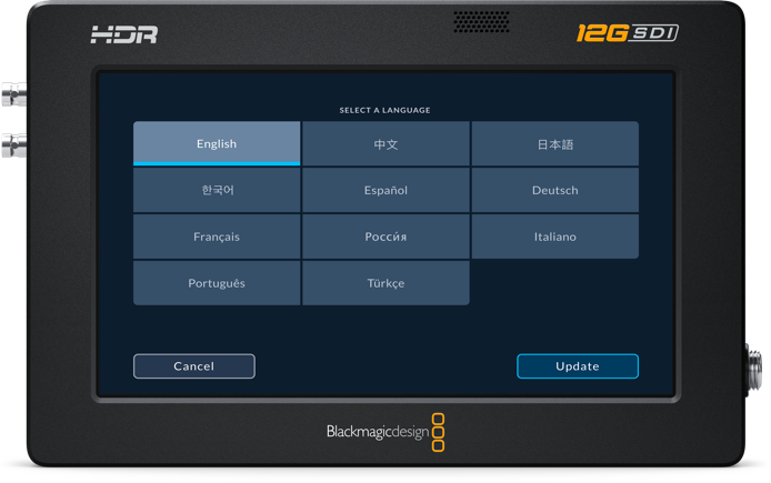 这款产品全面支持多语种操作,让您从此突破语言屏障!支持语言包括英语、中文、日语、韩语、西班牙语、德语、法语、俄语、意大利语、葡萄牙语以及土耳其语。首次开机时,Video Assist会显示菜单提示您选择语种,您也可以在菜单里切换语种。选定后,屏幕上显示的叠加文字会更改到相应语言显示,而视频输出画面上启用的叠加显示也会更改到所选语种。这意味着,任何国家和地区的制作团队都能顺利使用Video Assist,因为您可以根据需要随时到菜单中更改语言!