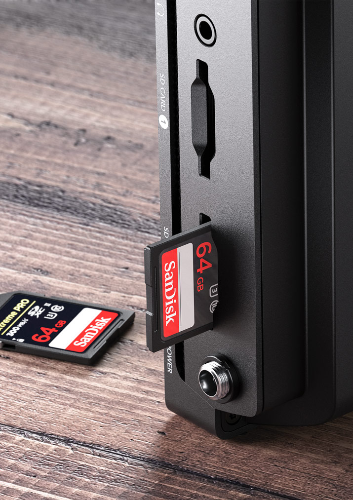 Video Assist使用市售易购的SD卡作为存储介质,您可以记录到闪存卡上。记录的文件尺寸很小,足以在标准SD卡或更快的UHS‑II卡上进行长时间记录。此外,较大的7英寸版Video Assist 12G型号还设有两个SD卡槽,方便您在记录期间替换录满的存储卡,实现长时间记录。标准的SD卡或速度更快的UHS‑II卡有着便携、高速、易购三大优势,因此是理想的播出介质。