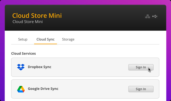 请确保将Blackmagic Cloud Store连接到网络。输入Blackmagic Cloud ID、Dropbox或Google Drive账户信息,从而让Cloud Store获得访问权限以实现同步。