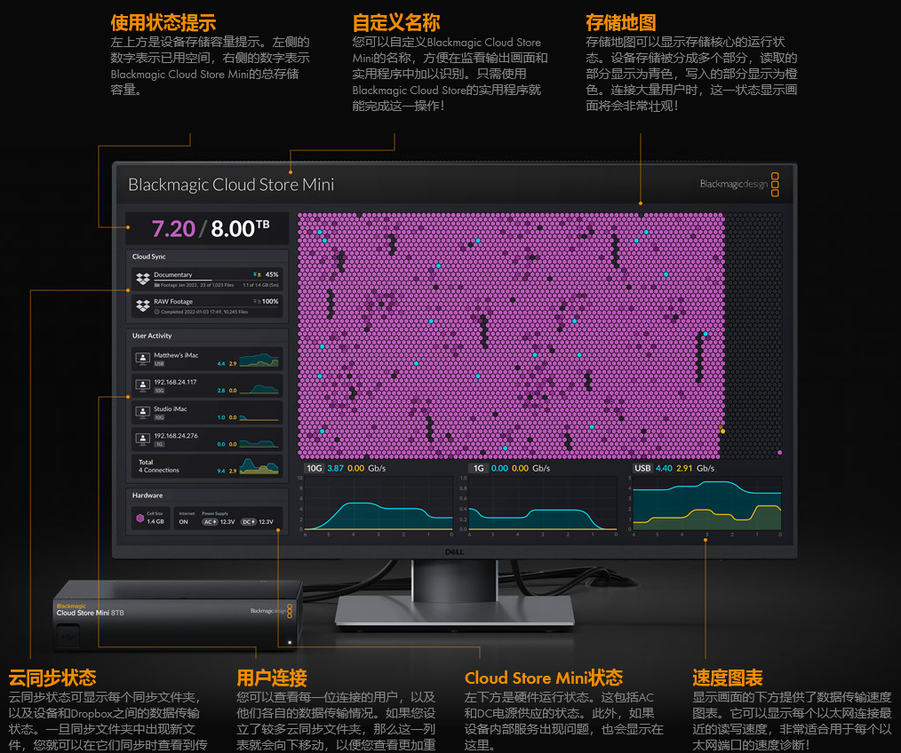 设备的HDMI监看输出是它的功能亮点!只要连接电视机或者计算机显示器,您就能查看Blackmagic Cloud Store Mini的实时状态了。存储地图能通过直观的图表来反馈设备存储核心的处理进程以及当前连接用户的实时读写状态,提供清晰舒适的视觉反馈!此外,还有其他图表用来显示以太网连接的数据传输状态。主要空间提示可以告诉您设备存储核心的容量,及其当前占用情况。您还可以为设备添加自定义名称!每个Blackmagic Cloud、Dropbox和Google Drive连接的状态也会显示出来,连接的用户以及设备电源状态也都一目了然。