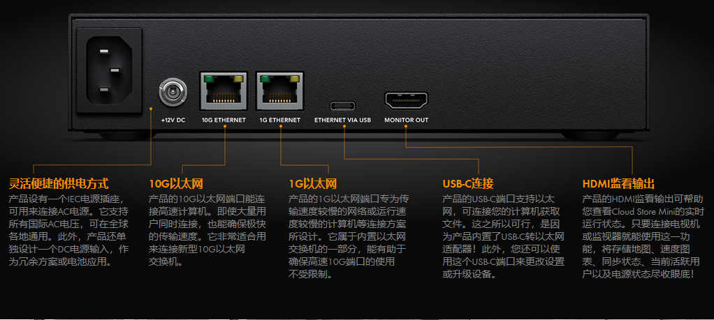 Blackmagic Cloud Store Mini搭载一个高速10G以太网端口,一般只有昂贵的工作站计算机上才具备这一端口。有了10G以太网加持,您就能获得10倍于常规以太网的传输速度。而且,大部分计算机都可以添加并升级到10G以太网。Blackmagic Cloud Store Mini具备高速性能,可轻松获得10G以太网端口的高速运行能力。即使连接到以太网交换机,面对数十位用户同一时间存取文件,它也能应对自如。10G以太网端口具备低延迟特性,可实现快速存取。此外,设备还另设一个1G以太网端口,加上其USB-C端口也可实现以太网功能,因此您能将10G以太网端口留给速度更快的计算机使用。