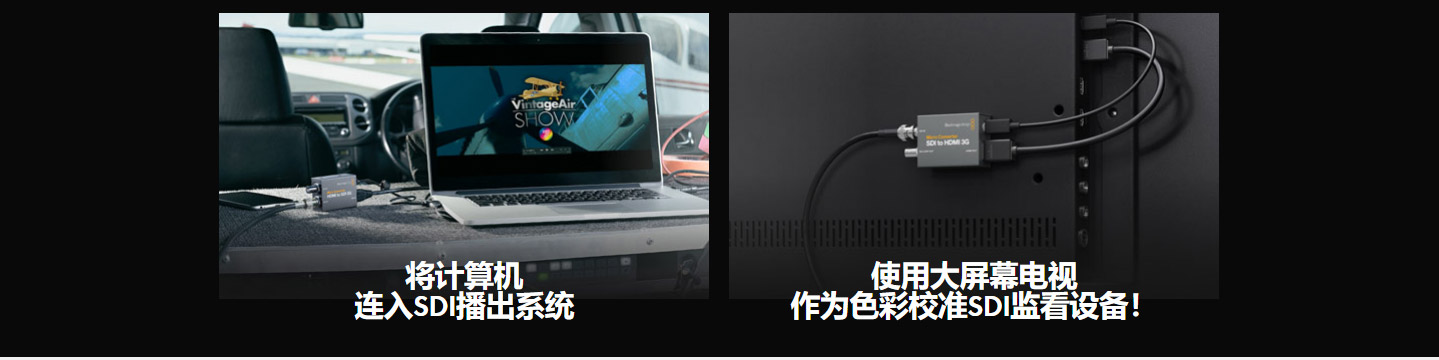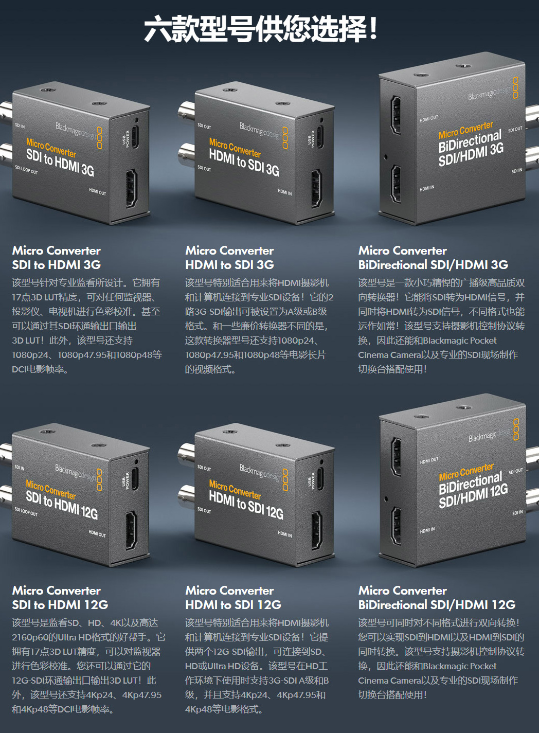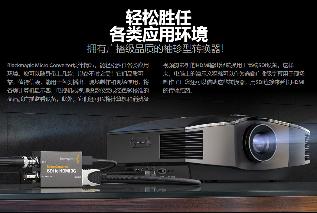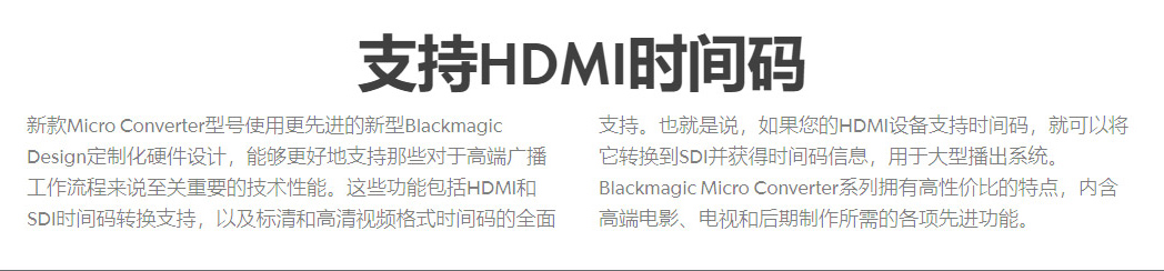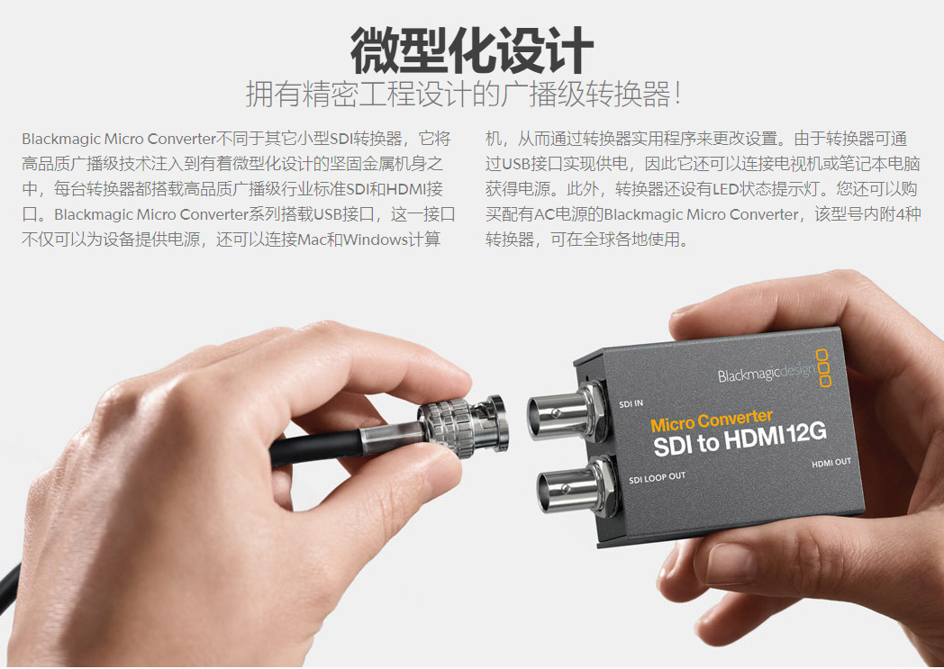Blackmagic Micro Converter系列转换器采用小巧设计,是一款广播级高品质视频转换器,该系列中的两款型号分别可从事SDI到HDMI以及HDMI到SDI的转换工作。Blackmagic Micro Converter将微型化机身和耐久设计融于一体,可巧妙隐藏且不易察觉!这款转换器设有HDMI和专业的3G-SDI接口,可从事SD和HD上至1080p60的格式转换,并配备外部电源。Micro Converter系列可以通过USB获得电源,直接连接到大屏幕彩电或笔记本电脑上即可开始工作,无需连接到墙面插座也可运行!