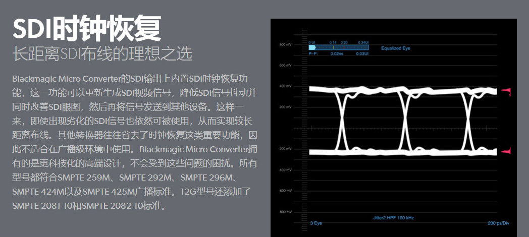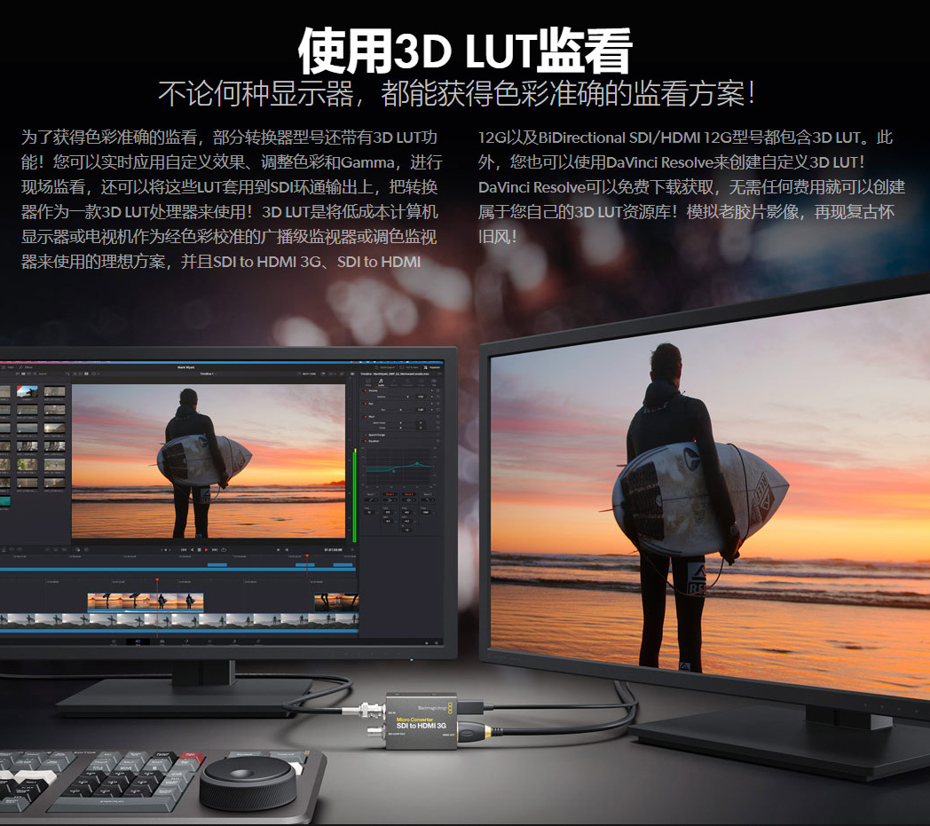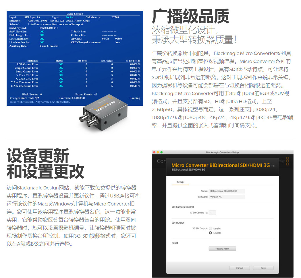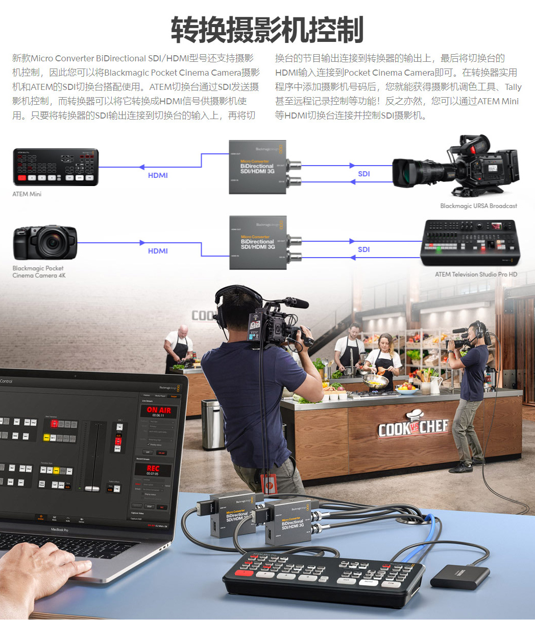 Blackmagic Micro Converter系列转换器采用小巧设计,是一款广播级高品质视频转换器,该系列中的两款型号分别可从事SDI到HDMI以及HDMI到SDI的转换工作。Blackmagic Micro Converter将微型化机身和耐久设计融于一体,可巧妙隐藏且不易察觉!这款转换器设有HDMI和专业的3G-SDI接口,可从事SD和HD上至1080p60的格式转换,并配备外部电源。Micro Converter系列可以通过USB获得电源,直接连接到大屏幕彩电或笔记本电脑上即可开始工作,无需连接到墙面插座也可运行!