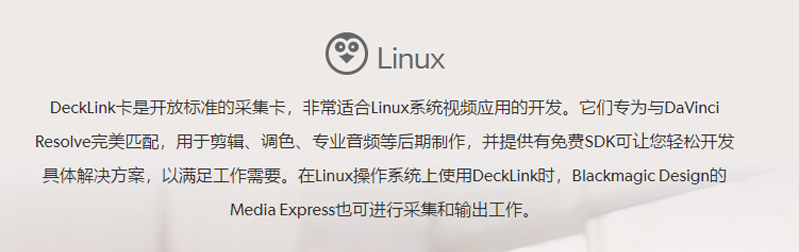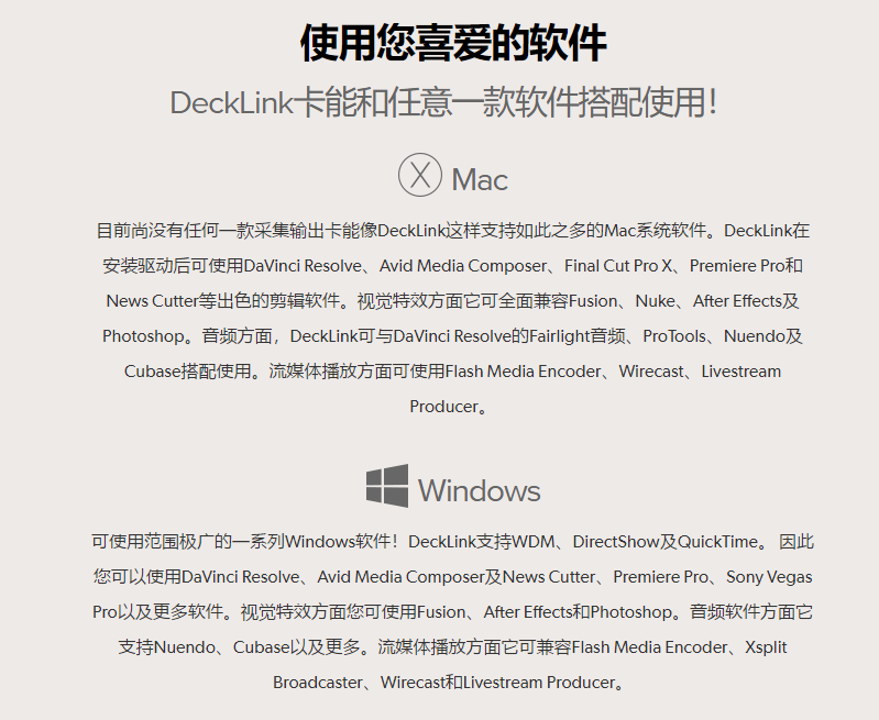 DeckLink可支持比其他任意采集卡都多的剪辑、设计和视频软件,您能自由使用自己喜爱的创意软件。它也支持任意Mac OS X、Windows和Linux视频软件,您可根据需要在任意操作系统间移动使用!它可全面兼容Final Cut Pro、Media Composer、Premiere Pro CC等更多软件,并能使用After Effects CC和Photoshop CC完成各种酷炫视觉特效!用DaVinci Resolve完成无与伦比的调色工作,并无缝使用ProTools进行音频制作。DeckLink所支持的软件范围极广,与工作流程的每一部分都紧密贴合!