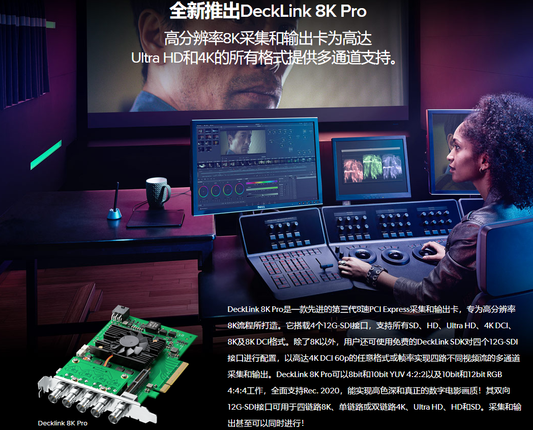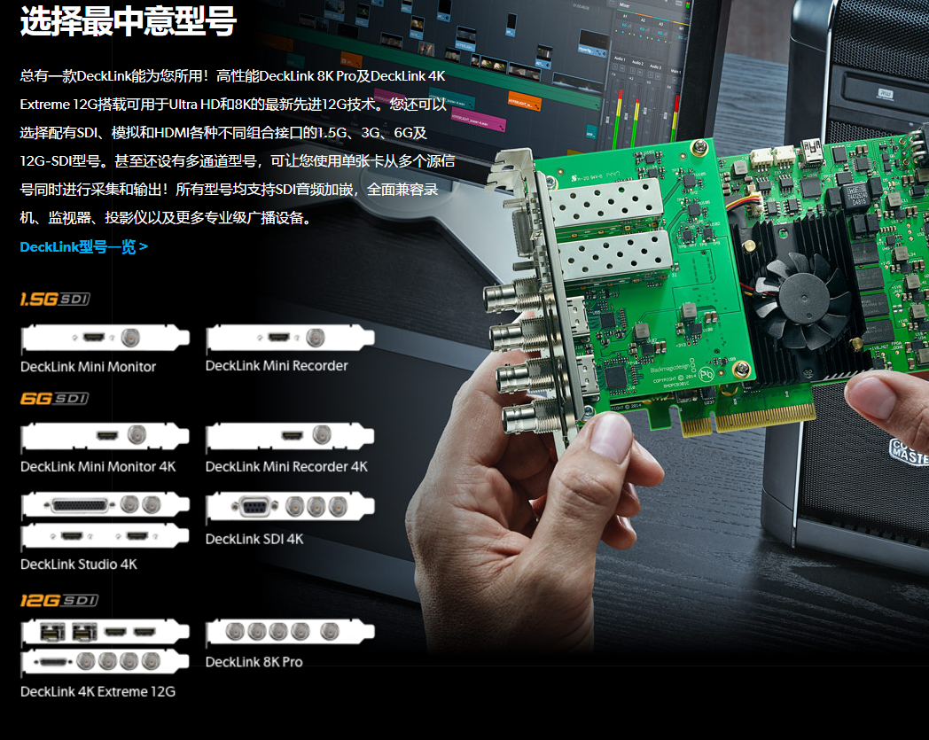 DeckLink卡支持范围宽广的视频格式和分辨率,并配备各种类型视频音频接口,为您提供灵活性和工作质量。它能轻松与世界流行音频视频剪辑软件配合使用。DeckLink卡可把摄像机、录像机和现场信号直接采集到剪辑、特效和广播设计系统。DeckLink SDI 4K、DeckLink Studio 4K、DeckLink 4K Extreme和DeckLink 4k Pro可应对并满足客户提供的普通SD和HD工作乃至Ultra HD和4K电影长片等任何格式的工作要求!