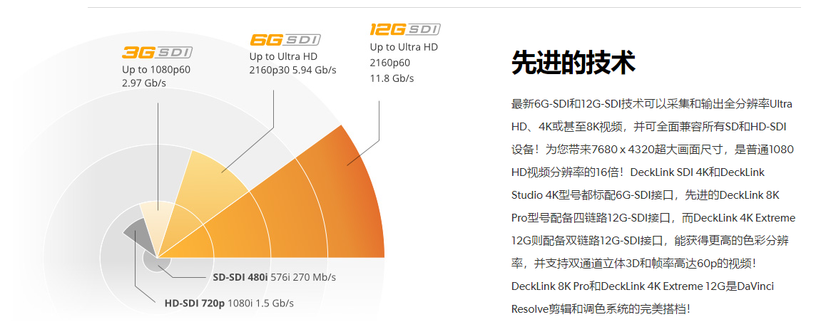 DeckLink可用于任何视频格式和分辨率!DeckLink卡可将摄像机、录机和现场信号采集到DaVinci Resolve等软件程序中直接进行剪辑、特效和设计等制作。根据您所选择的不同型号,DeckLink卡支持一整套格式范围,可用于当今高端电影、电视剧集以及商业广告的后期制作。您将获得12bit RGB支持和4:4:4画质色深及高动态范围,高帧率支持高达60帧每秒、立体3D以及更多!DeckLink产品拥有支持文件或磁带式工作流程的各种型号,可使用专业SDI监视器、HDMI电视机,甚至数字影院投影仪,在剪辑和调色工作室中完成理想监看工作。