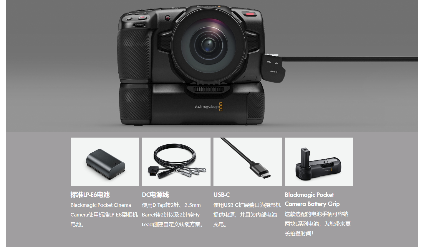Blackmagic Pocket Cinema Camera使用标准移动式LP-E6型电池,并配备一个带锁DC电源接口,双重保障可有效防止拍摄中途突发设备掉电的尴尬情况。摄影机自带的AC适配器可在连接摄影机的同时为电池充电。此外,您还能获得一组国际转换插头,不论身在何处都能无障碍使用。USB-C扩展端口可用来从移动充电设备、手机充电宝甚至笔记本电脑为电池充电。您甚至可以添加选配的Blackmagic Pocket Battery Grip电池手柄,通过两块电池显著延长摄影机的续航时间。如此灵活广泛的电源选择,长达一整天的拍摄也毫无压力!