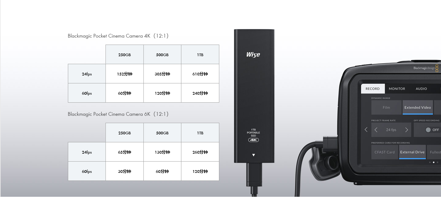 Blackmagic Pocket Cinema Camera摄影机系列搭载创新的高速USB-C扩展端口,其运行速度高达每秒5Gb。目前大多数新款计算机都配备USB-C接口,它还能提供电源,因此可以连接闪存盘和SSD等外部配件,大幅延长记录时间。高速外接硬盘足以应对Q0设置下最高固定质量的12bit Blackmagic RAW 6K影像拍摄,甚至能实现以更高帧率拍摄。更好的是,当拍摄结束后,您只要将外接硬盘直接连接到计算机上,就可以在这块用来记录的硬盘上开始剪辑和调色工作,节省了大量文件复制时间。