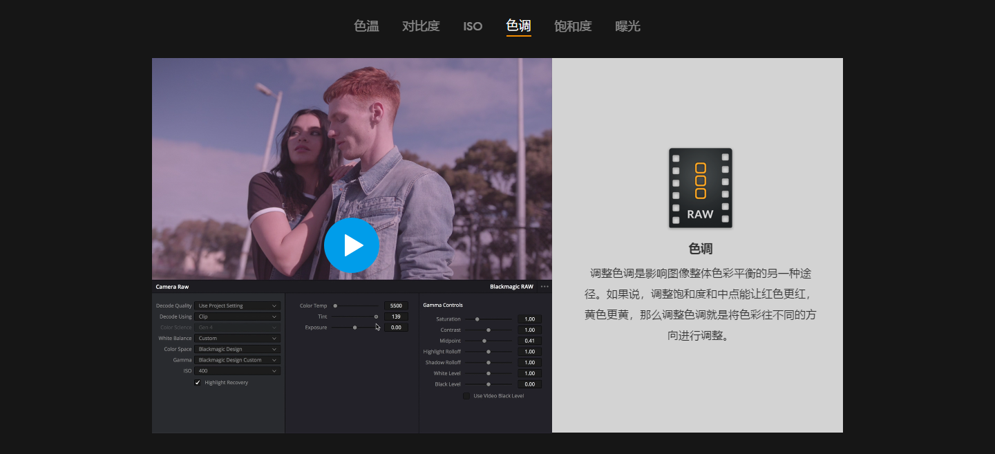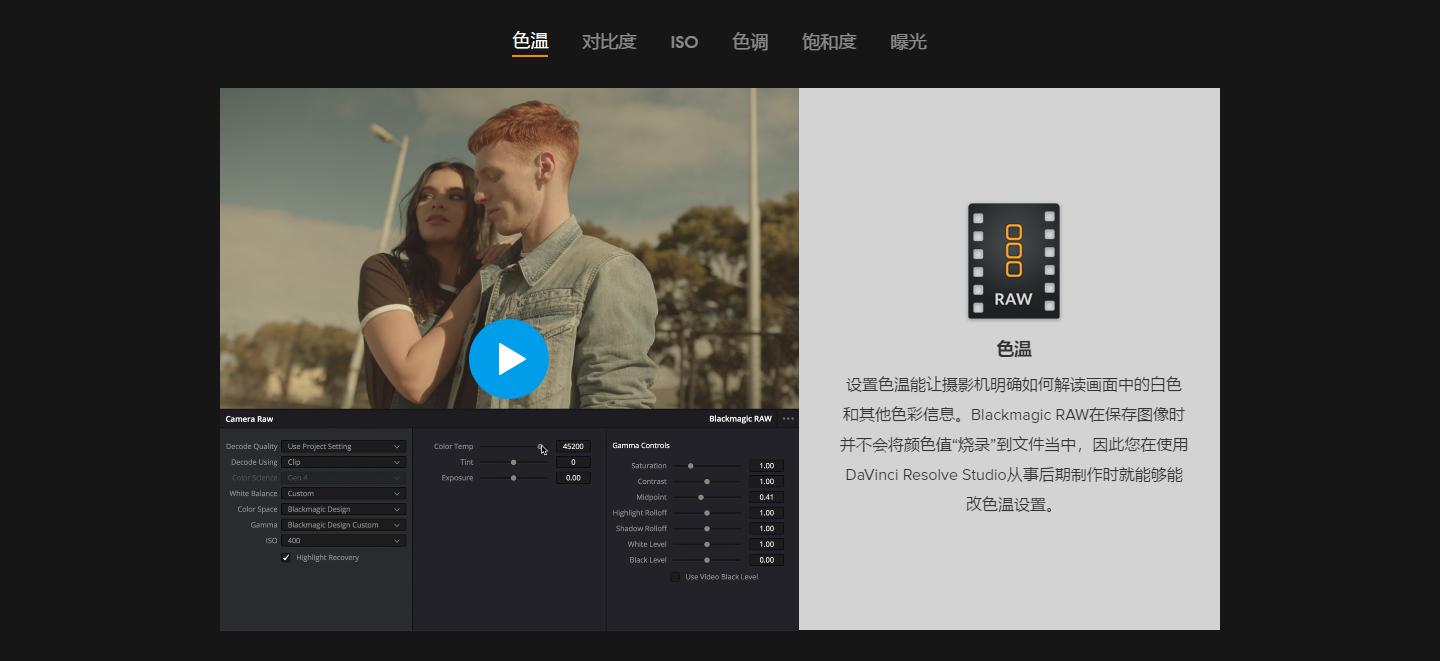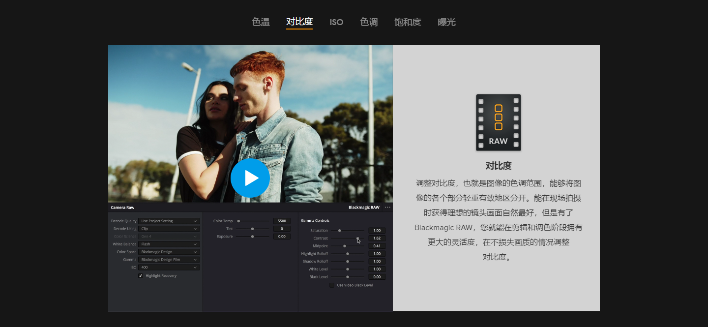 调整对比度,也就是图像的色调范围,能够将图像的各个部分轻重有致地区分开。能在现场拍摄时获得理想的镜头画面自然最好,但是有了Blackmagic RAW,您就能在剪辑和调色阶段拥有更大的灵活度,在不损失画质的情况调整对比度。