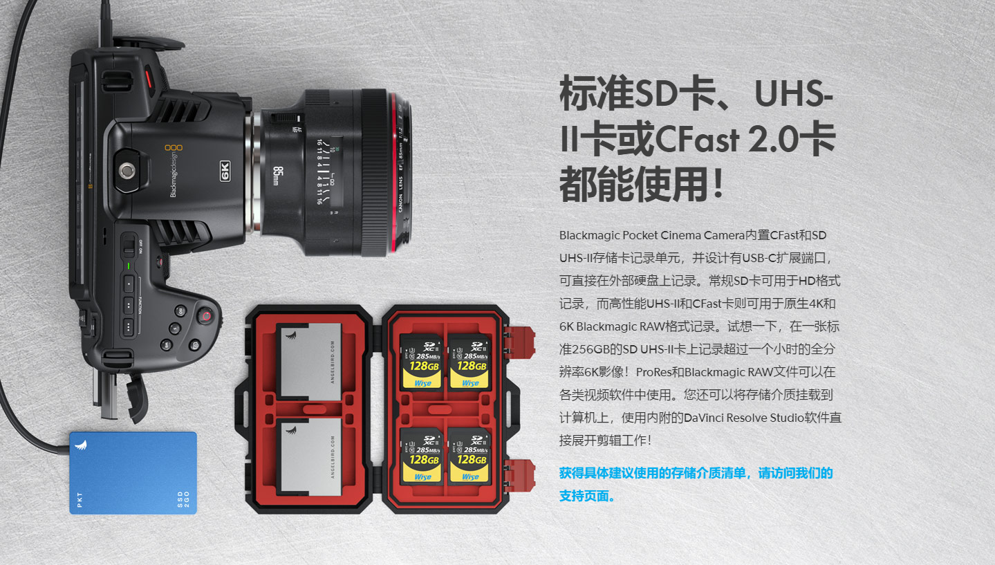 Blackmagic Pocket Cinema Camera内置CFast和SD UHS-II存储卡记录单元,并设计有USB-C扩展端口,可直接在外部硬盘上记录。常规SD卡可用于HD格式记录,而高性能UHS-II和CFast卡则可用于原生4K和6K Blackmagic RAW格式记录。如今,一张标准256GB的SD UHS-II卡能记录超过一个小时的全分辨率6K影像!ProRes和Blackmagic RAW文件可以在各类视频软件中使用。您还可以将存储介质挂载到计算机上,使用内附的DaVinci Resolve Studio软件直接展开剪辑工作!