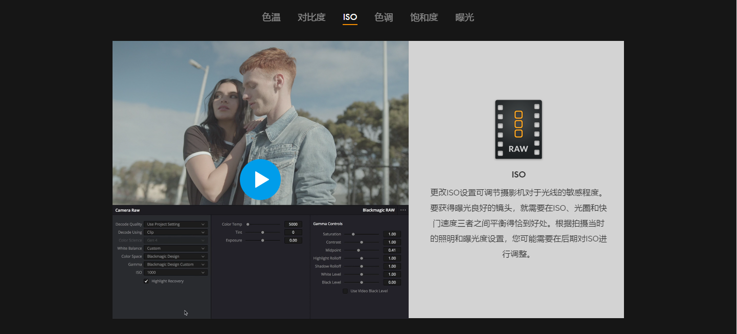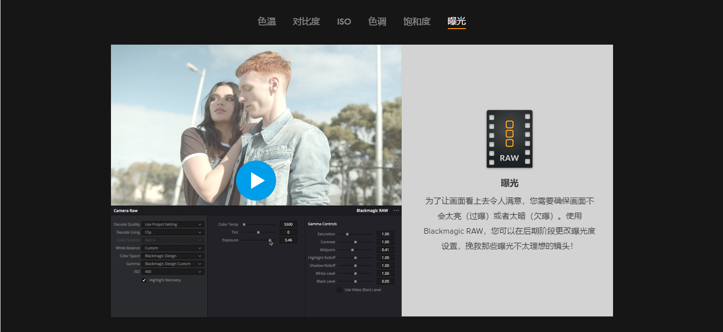 为了让画面看上去令人满意,您需要确保画面不会太亮(过曝)或者太暗(欠曝)。使用Blackmagic RAW,您可以在后期阶段更改曝光度设置,挽救那些曝光不太理想的镜头!