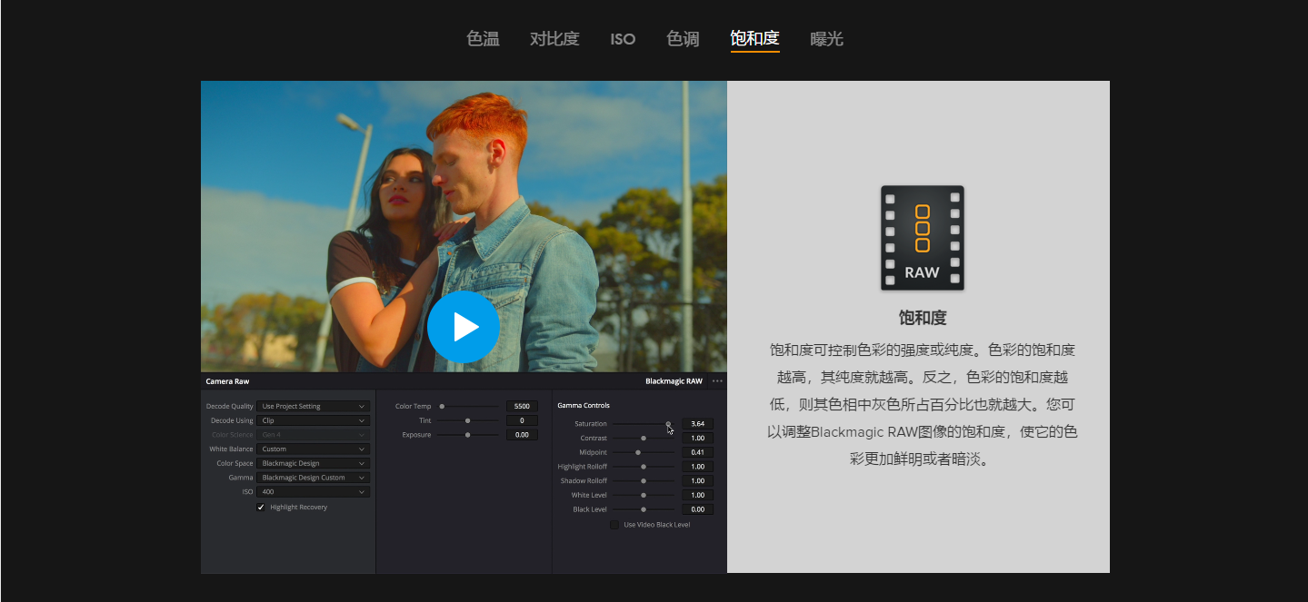 饱和度可控制色彩的强度或纯度。色彩的饱和度越高,其纯度就越高。反之,色彩的饱和度越低,则其色相中灰色所占百分比也就越大。您可以调整Blackmagic RAW图像的饱和度,使它的色彩更加鲜明或者暗淡。
