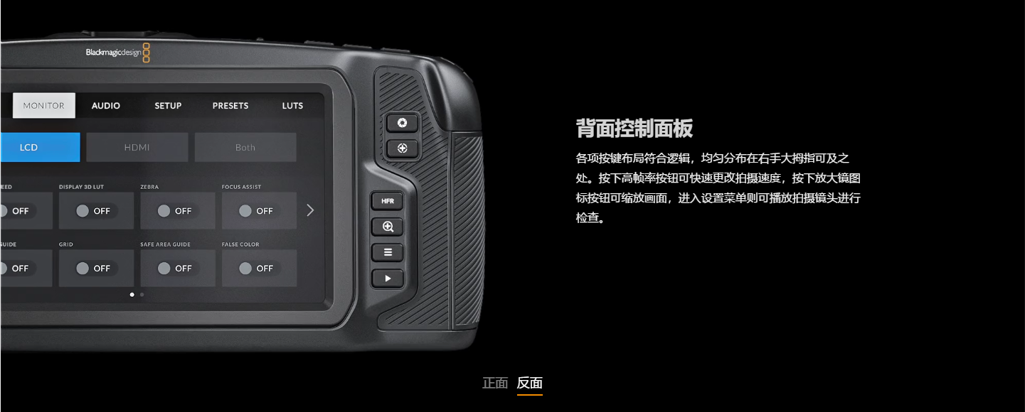 摄影机的多功能手柄采用舒适而熟悉的设计,将ISO、白平衡、快门等几项重要功能的按钮分布在您触手可及之处,食指位置还专门设计了一个控制滚轮,可快速实现光圈调整。有了这些周全而快捷的控制功能,您再也不必为了找一个控制指令,手忙脚乱地在小到看不清的屏幕菜单中层层翻查!Blackmagic Pocket Cinema Camera摄影机系列的记录和静帧按钮采用符合逻辑的合理布局,动动手指就能实现操控。其中包括用户可自行指派的多功能按钮,以及高帧率、对焦缩放、菜单设置、播放等控制按钮。