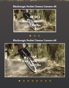 根据不同型号,Blackmagic Pocket Cinema Camera摄影机能以HD到DCI 4K乃至6K在内的各类标准分辨率和帧率进行拍摄。此外,6K型号还能拍摄获得2120万像素的静帧照片;4K型号则能拍摄获得880万像素的照片。新推出的6K型号能以高达50fps的帧率拍摄6144 x 3456 16:9画幅影像,以高达60fps的帧率拍摄6144 x 2560 2.4:1画幅影像,还能以高达60fps的帧率拍摄5744 x 3024 17:9画幅影像。如果追求更高的帧率,您可以使用裁切传感器模式,拍摄上至120fps的2.8K 2868 x 1512 17:9画幅影像。使用变形镜头以3.7K 60fps 3624 x 3020的格式和参数进行拍摄时,甚至还能获得真正的6:5变形画幅。使用4K型号时,则能拍摄上至60fps帧率的4K DCI 4096 x 2160分辨率影像,或者上至60fps帧率的Ultra HD 3840 x 2160分辨率影像,甚至还能拍摄120fps帧率的1080HD影像!