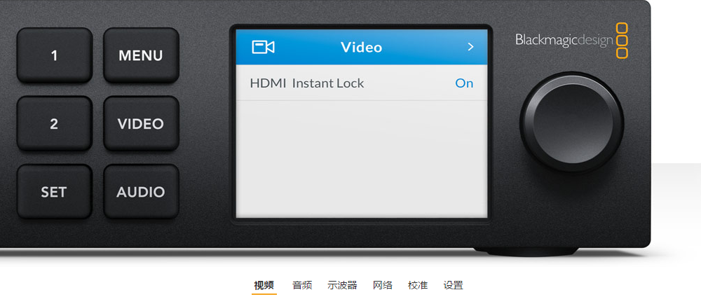 产品的前面板LCD提供监看画面和准确的音频电平表。菜单可控制所有功能,您可以轻松滚动菜单页面寻找需要调整的设置。按下按钮1或2即可启用3D LUT。通过菜单就能开始校准,只需根据提示即可校准显示器。音频表可在VU和PPM轨迹之间切换。遇到输入视频发生中断的