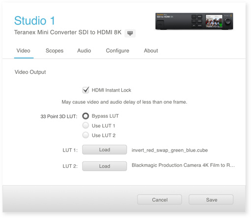 Teranex Mini SDI to HDMI 8K HDR包含与电影行业同样的优质33点3D LUT。3D LUT尤其适合创造出胶片效果,也可以为连接的显示器提供比色法补偿。您甚至可以通过连接第三方USB色彩探测器来校准连接的显示器,Teranex Mini SDI to HDMI 8K HDR会分析监视器,并生成3D LUT校正显示器之间的色差。设备可加载两个独立的3D LUT,您可以通过前面板进行选择。3D LUT采用标准文件格式,您可以加载DaVinci Resolve等软件生成的LUT。