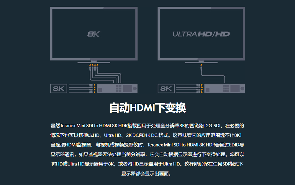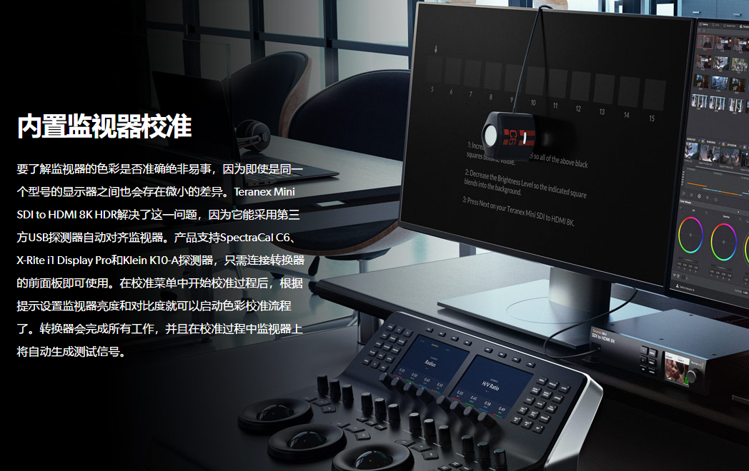 HDR是运行大型投影仪和经本地色彩校准显示器的理想方案。Teranex Mini SDI to HDMI 8K HDR兼容多款电视机和监视器。然而要获得更加准确的色彩,监视器是理想选择,因为拥有稳定的图像处理机能,并且在执行校准后色彩不会偏移太多。