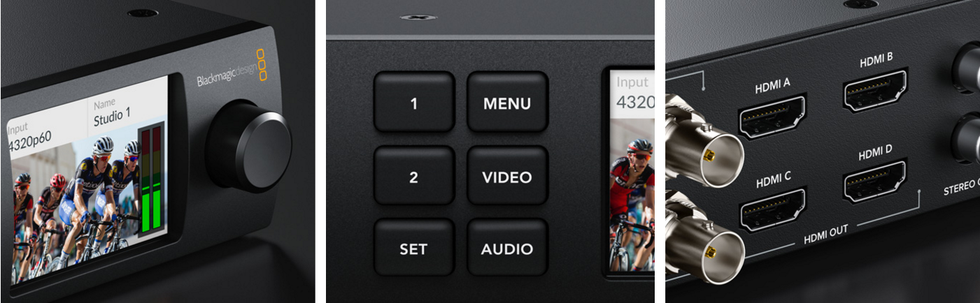 这款转换器能实现机架式安装,因此它在设计创新方面远超普通转换器。其前面板配有按钮和彩色显示屏,视频监看时显示音频表和视频格式,放置在桌面上也美观大方。后面板搭载四链路12G-SDI,兼容HD、Ultra HD和8K格式。4路HDMI输出可连接带4路HDMI输入的8K电视机,下变换器可在Ultra HD或HD电视机上使用8K信号源。您甚至可以在交替双取样(2-Sample Interleave)和四分法模式(Square Division)之间自动转换!此外还配有AC电源、模拟音频HiFi输出以及前面板USB接口用于添加监视器校准探测器。
