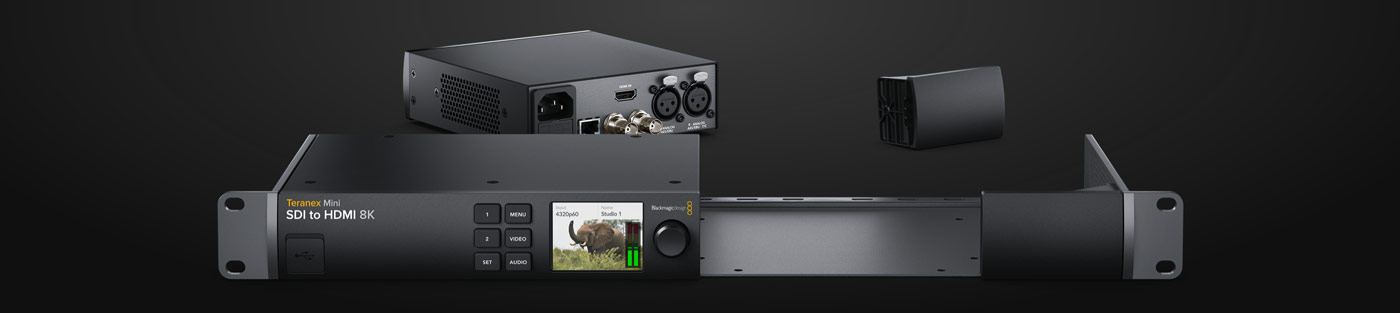 如要机架安装可添加Teranex Mini Rack Shelf。机架配有金属盘,用螺丝固定转换器后整层可以安装在机架上。Teranex Mini Rack Shelf包含数块空白面板,当您只想安装一台转换器,但并不希望机架上出现碍眼的空洞时,可以使用螺丝将这些面板固定在机架上。当然,Teranex Mini SDI to HDMI 8K HDR还包含橡胶垫,在转换器下方安装后可将转换器放置在桌面。