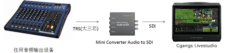 音频可通过调音台,或其他输出设备输入到Mini Converter Audio to SDI都可以将声音转换成SDI信号,从而将高质量的声音输入到Cgangs Livestudio中进行直播使用。
