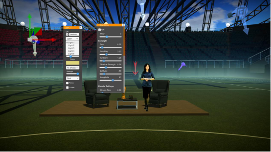 Cgangs Livestudio V3D无轨虚拟系统可以有效的设置环境信息,支持24小时时间轴调整,支持运动天空云层效果,及灯光控制等。