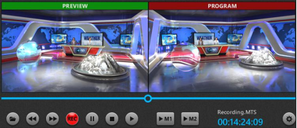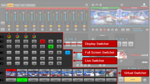 Cgangs V3D增强版可以在虚拟机位、实时视频、和本地媒体素材之间进行切换,可以实现硬切、转场、混合等效果。
